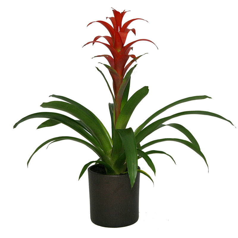 Γκουσμάνια κόκκινη σε καφέ πήλινο κασπώ.