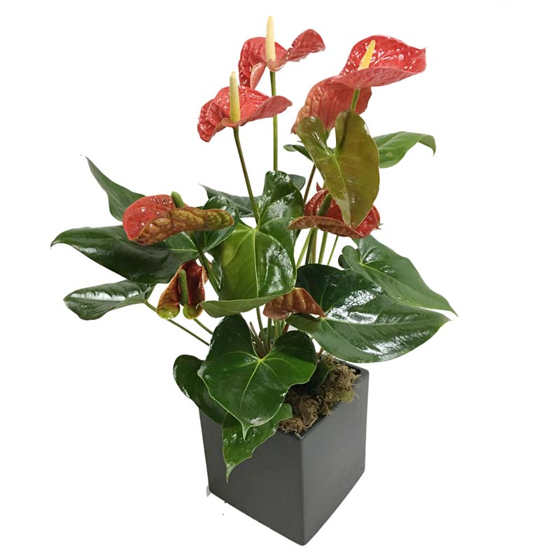 Κόκκινο ανθούριο σε πήλινο μοντέρνο τετράγωνο κασπώ