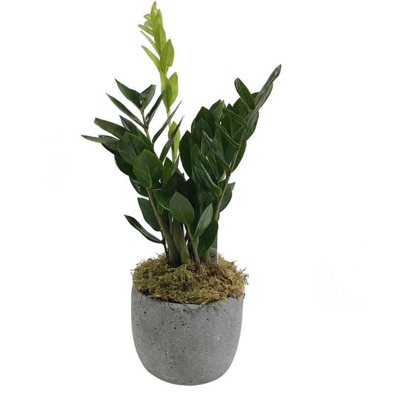 Zamioculcas φυτεμένη σε τσιμεντένιο μοντέρνο κασπώ χρώματος γκριλ.