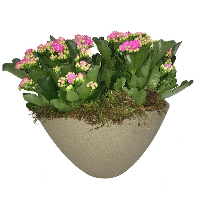 Μοντέρνο πήλινο κασπώ σχήματος οβάλ και χρώματος καφέ-μόκα,φυτεμένο με 2 καλαγχόες εισαγωγής χρώματος της επιλογής σας.